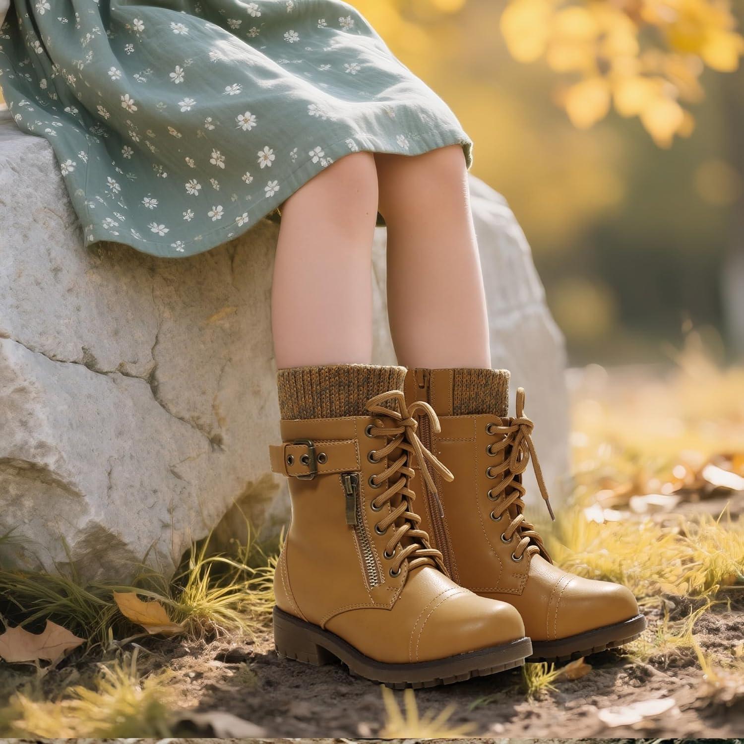 DREAM PAIRS Girl’s Mid Calf Combat Ankle Lace up Boots(Camel)