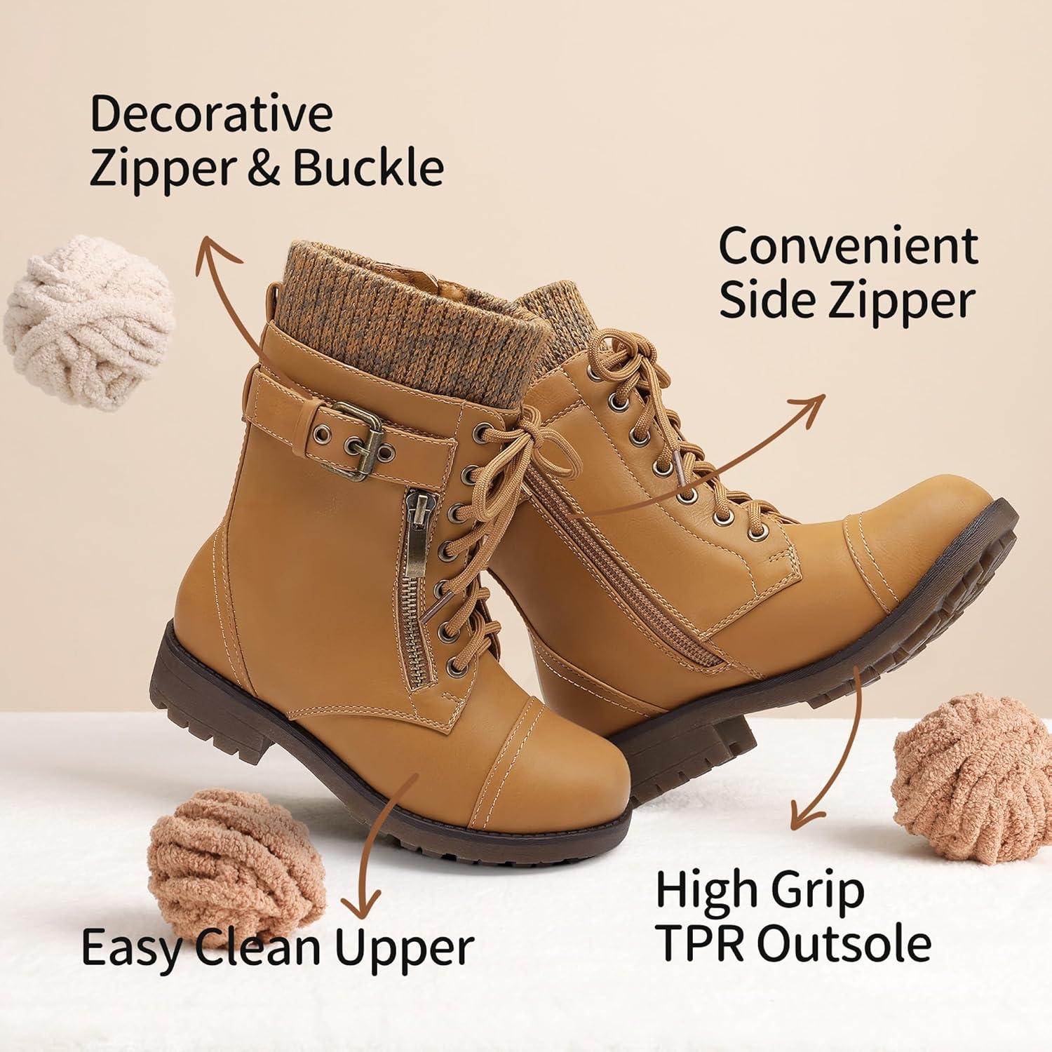 DREAM PAIRS Girl’s Mid Calf Combat Ankle Lace up Boots(Wheat)