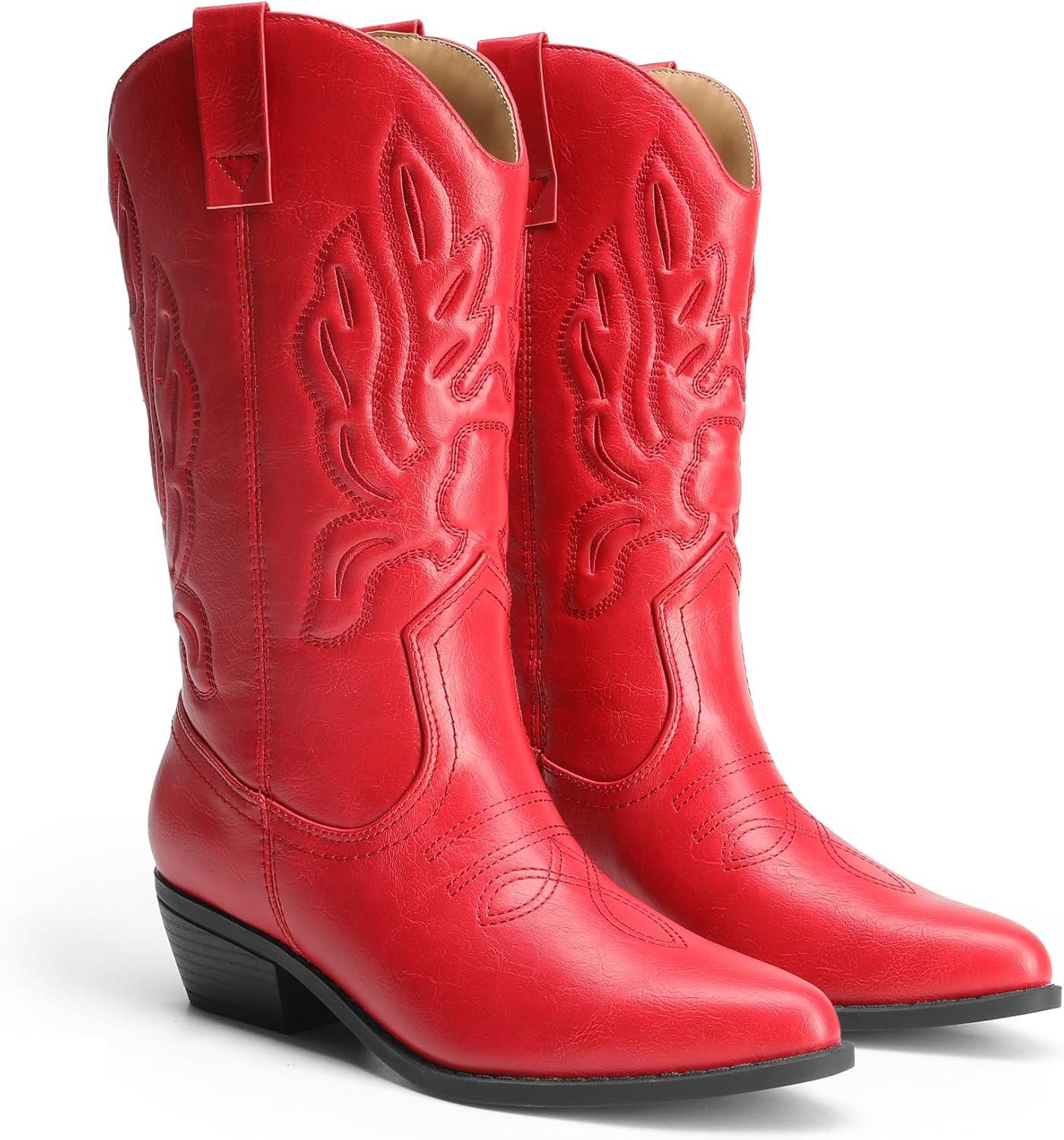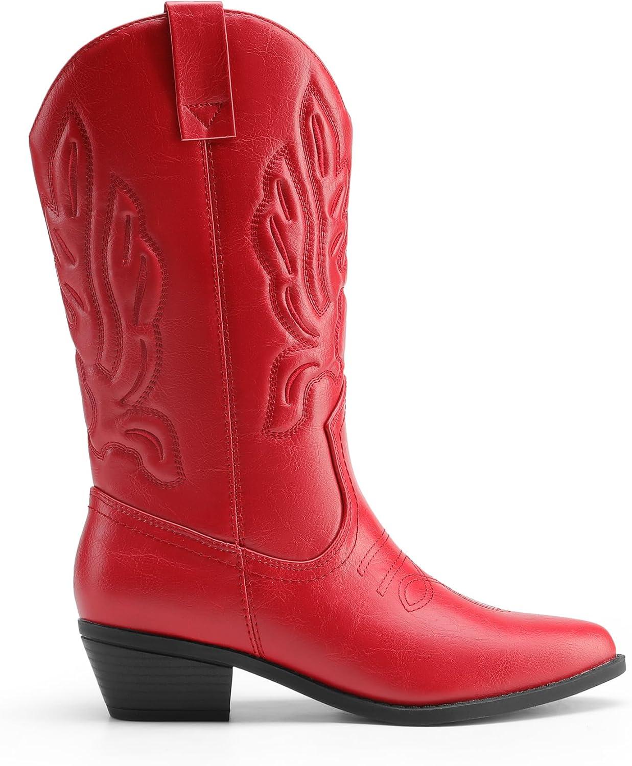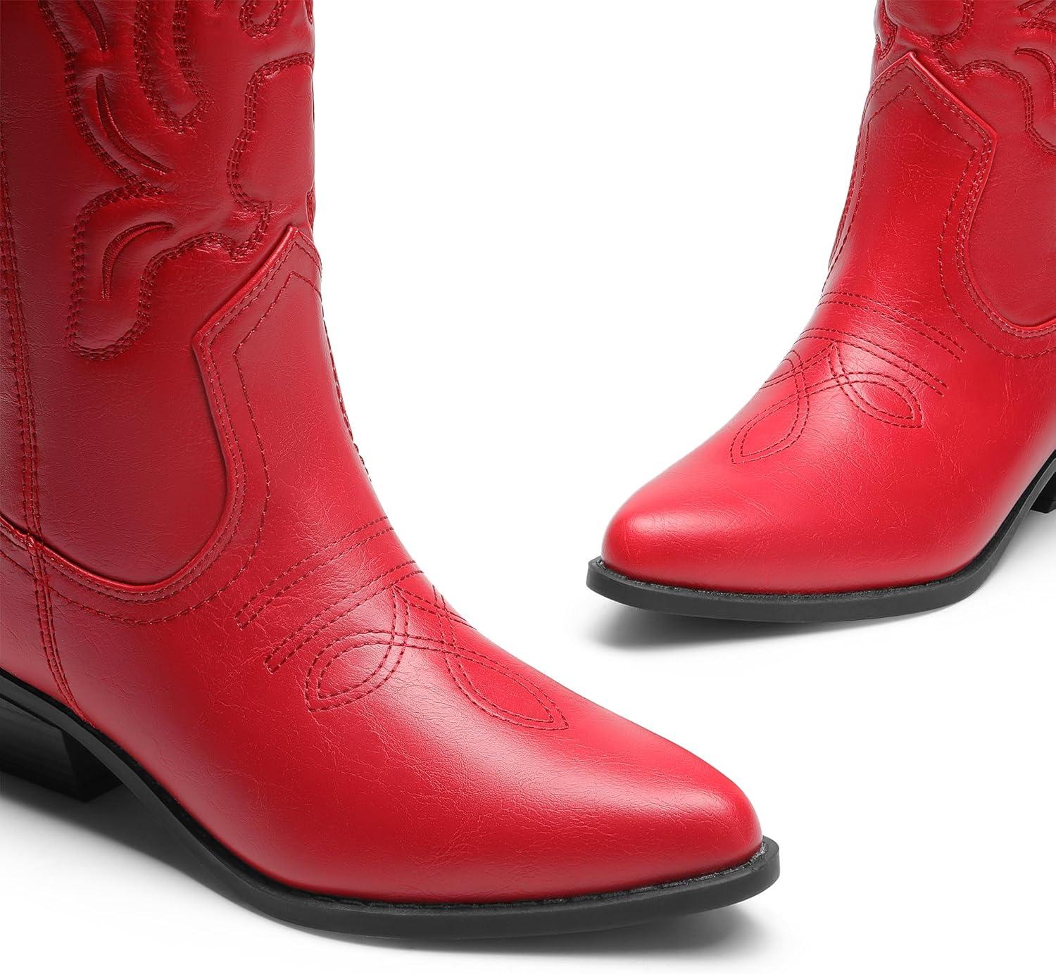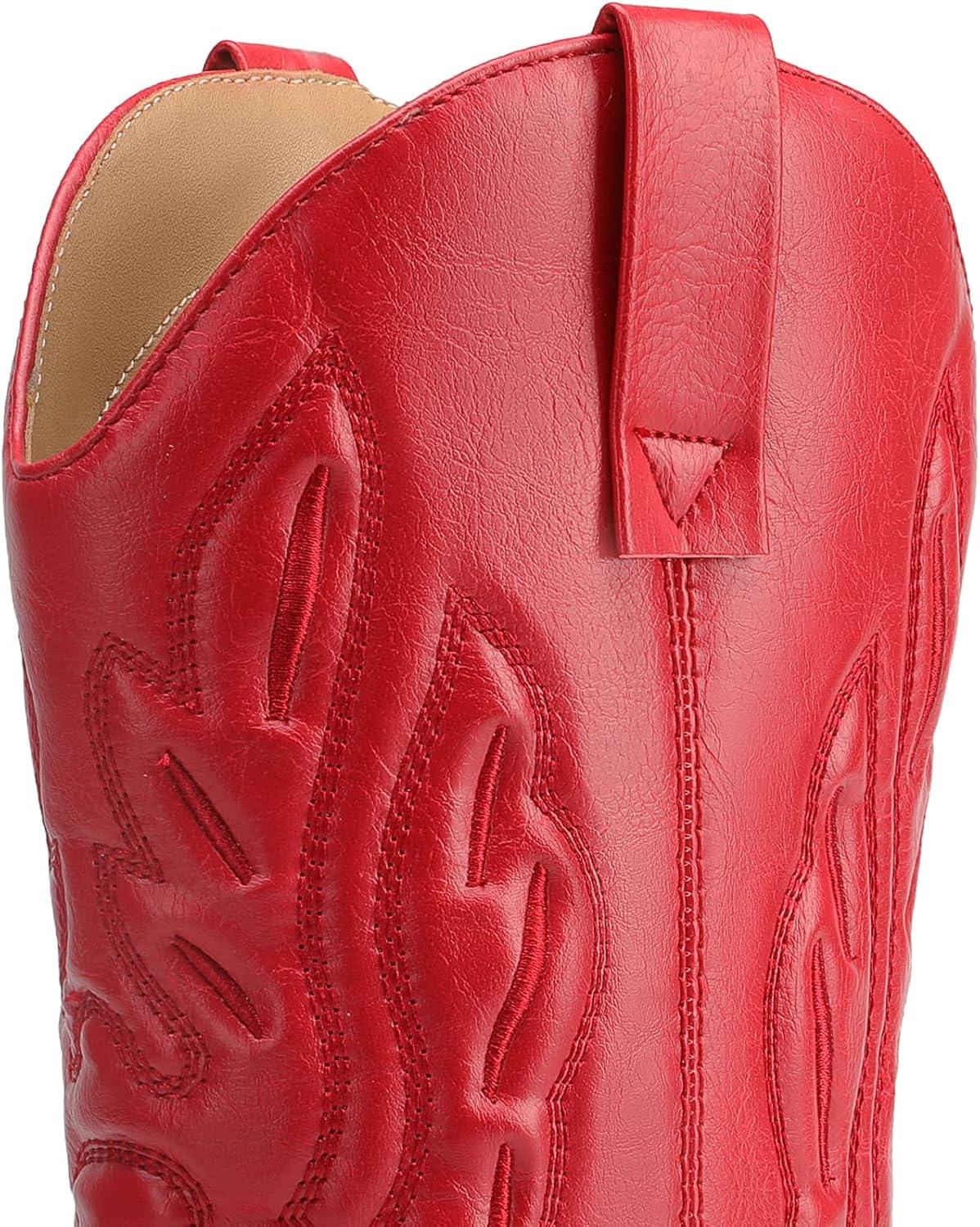 DREAM PAIRS Women’s Cowboy Boots Mid Calf Cowgirl Boots Embroidery Stitched Western Boots(Red)