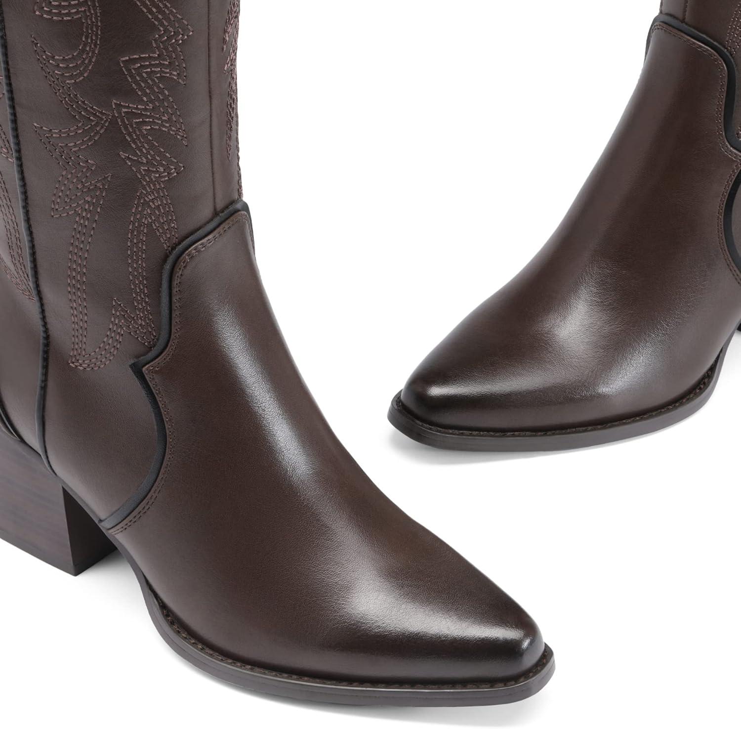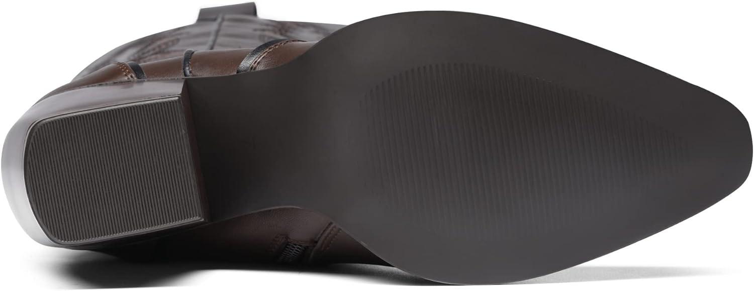 DREAM PAIRS Womens Cowboy Boots Wide Calf Comfortable Pull On Zipper Chunky Heel Pointed Toe Embroidered Western Cowgirl Knee High Boots Ladies Retro Tall Boot(Brown/Pu)