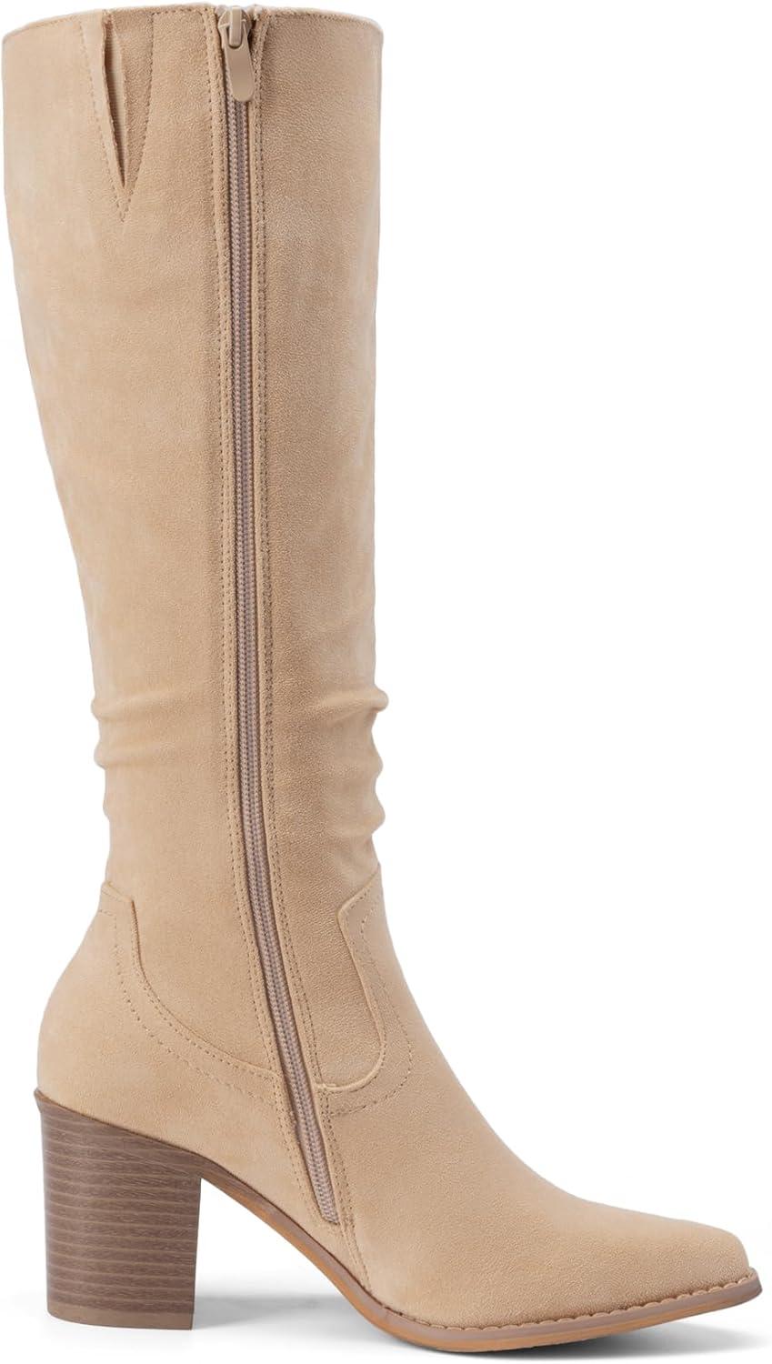 DREAM PAIRS Women’s Knee-High Boots, Comfortable Chunky Block Heel Pointed Toe Pull On Side Zipper Suede Slouch Riding Boots(Apricot)