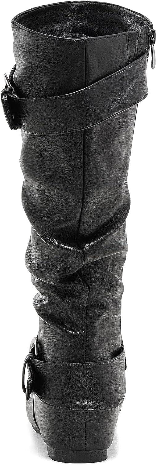 DREAM PAIRS Women's Knee High Low Hidden Wedge Boots Suede Faux Fur Lining Side Zipper Knee High Buckle Boots(Ura-black)