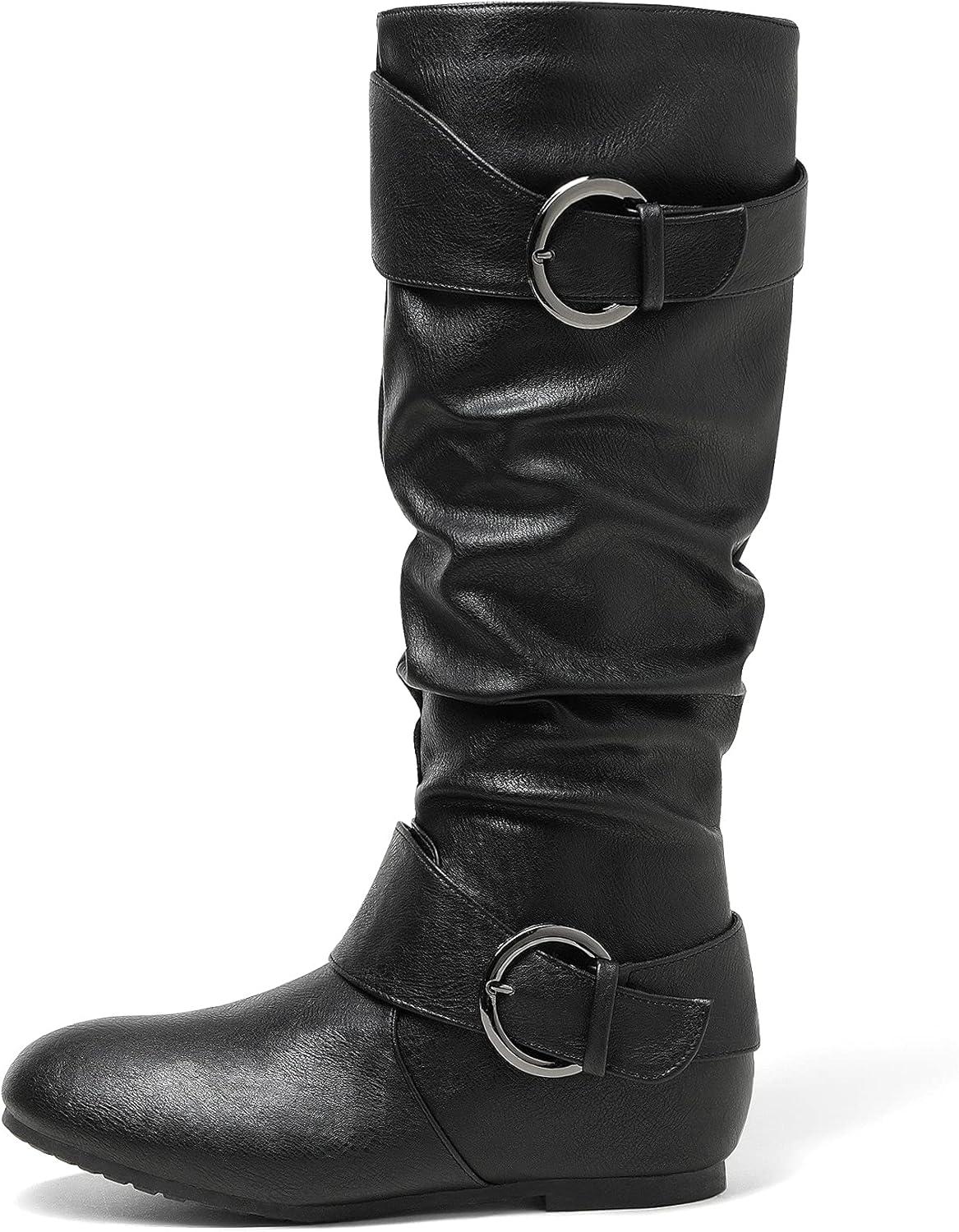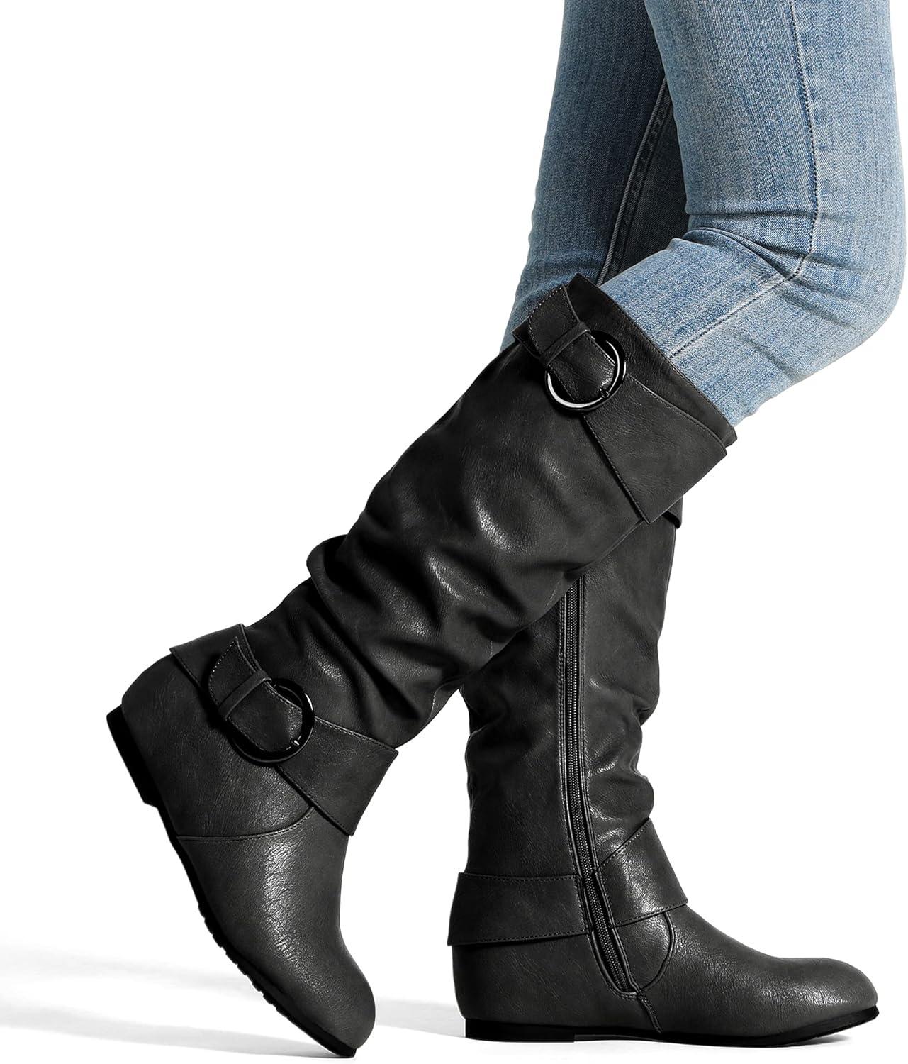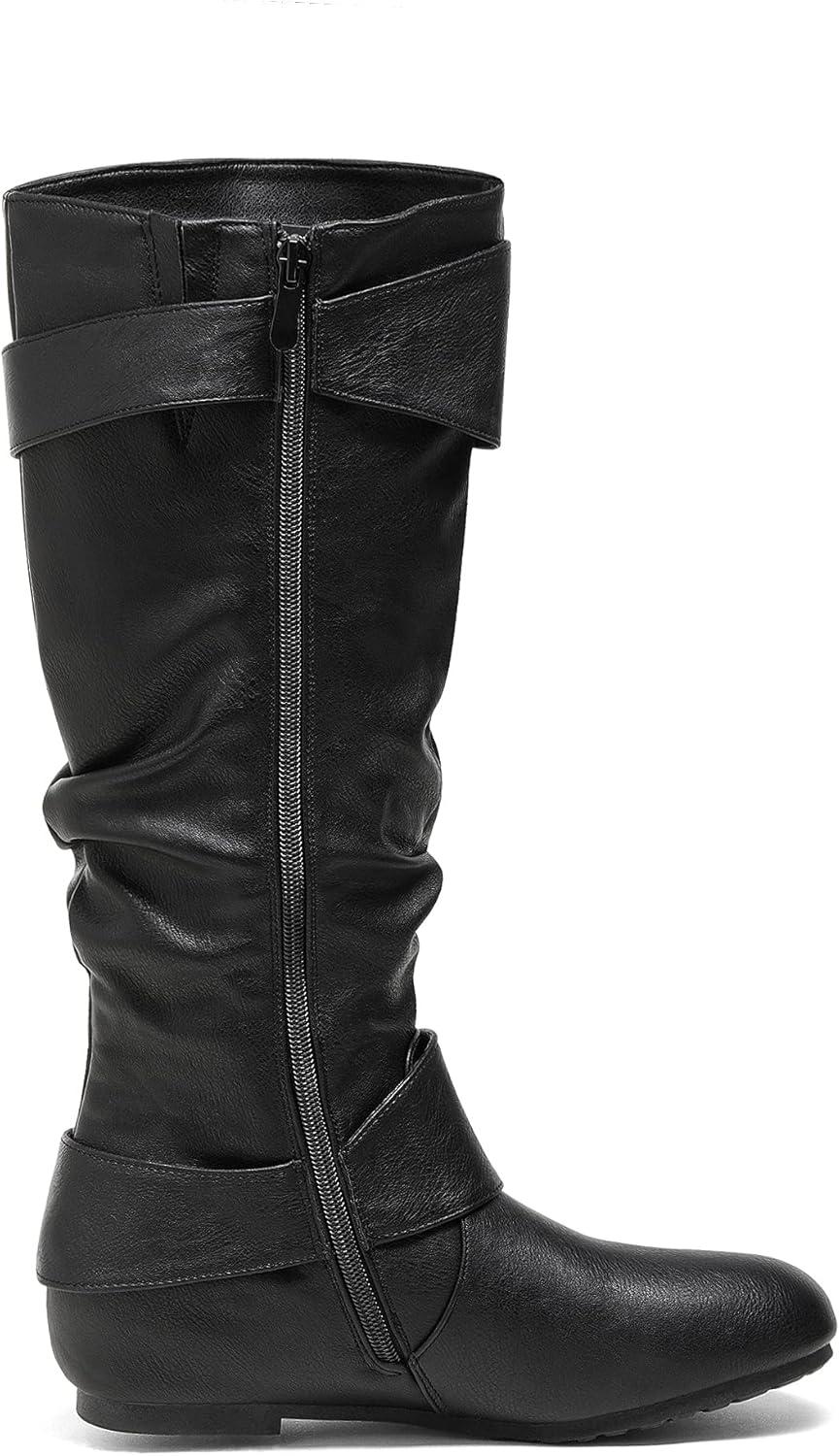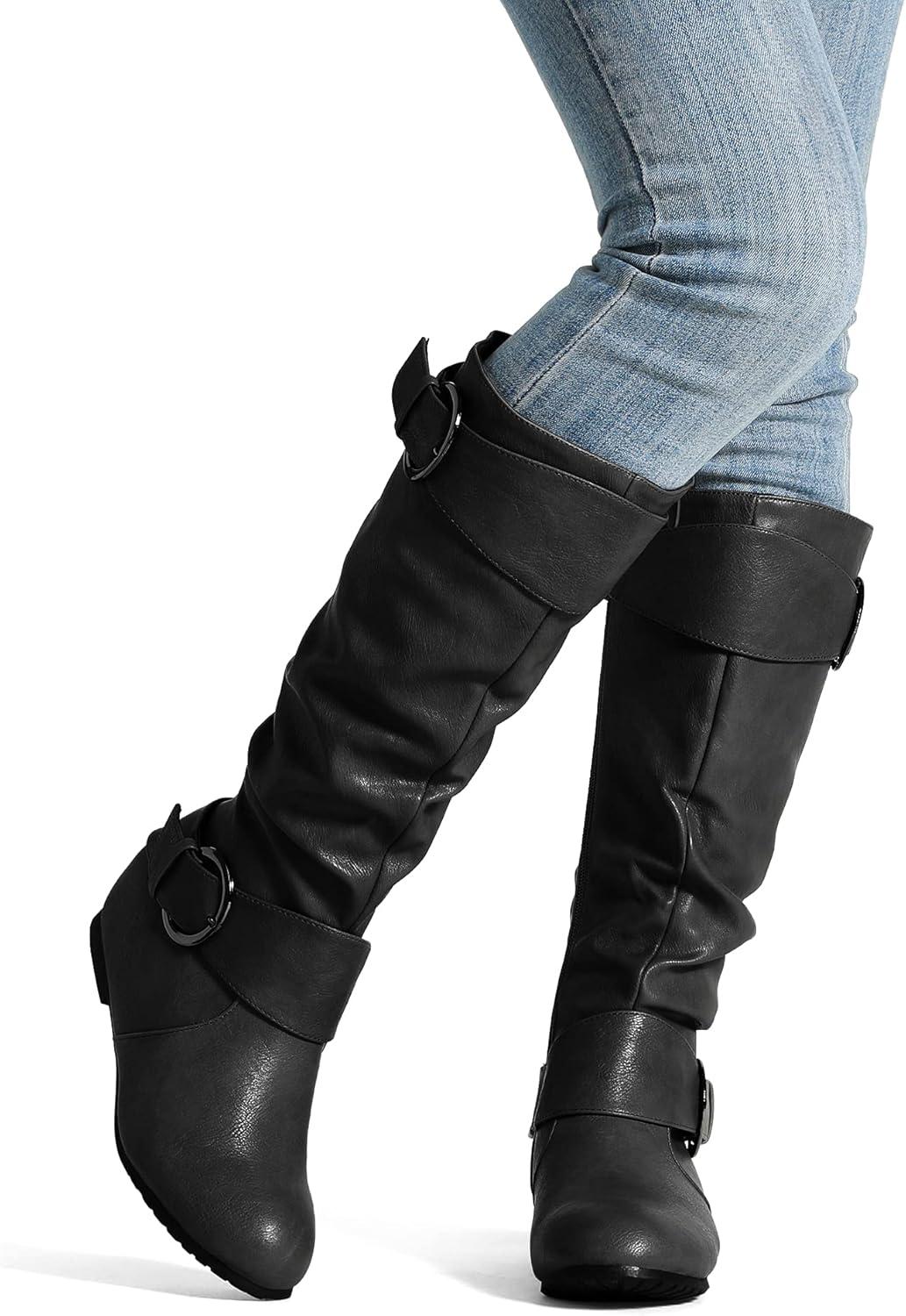 DREAM PAIRS Women’s Knee High Low Hidden Wedge Boots Suede Faux Fur Lining Side Zipper Knee High Buckle Boots(Ura-black)