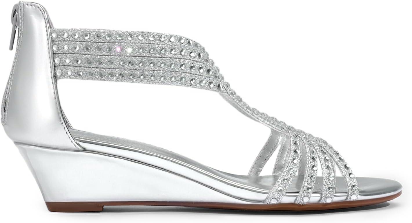 imageDREAM PAIRS Womens Open Toe Low Wedges Sandals Rhinestone Strappy Zipper Dress Shoes Summer Wedding Party Travel ShoesSilverpat