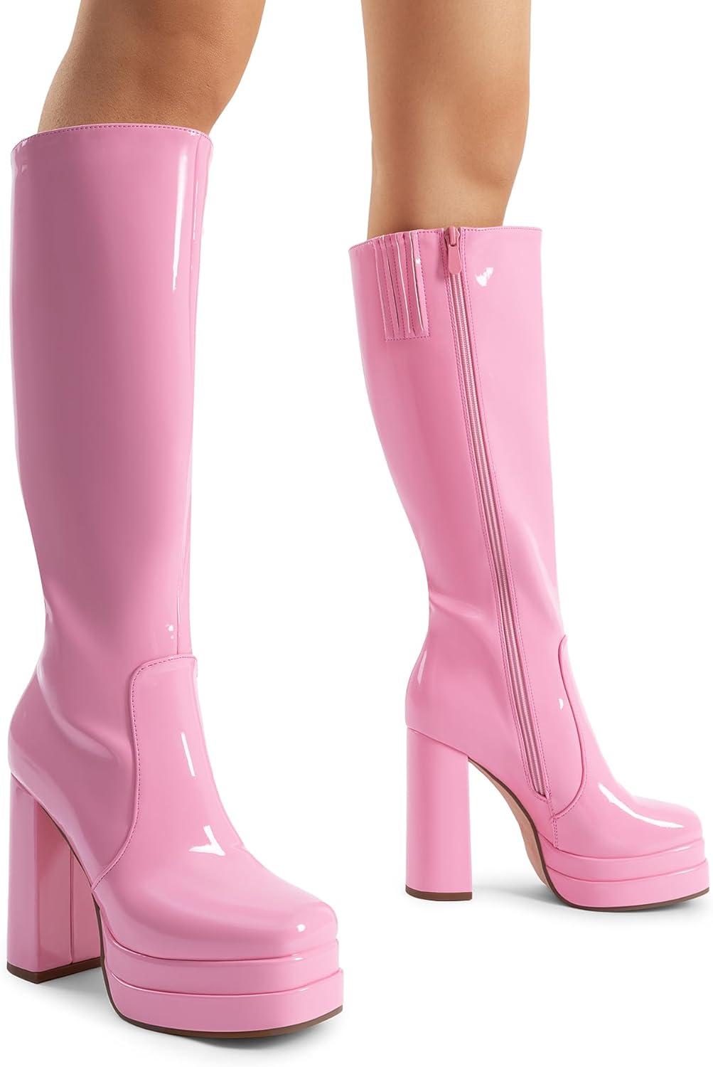 DREAM PAIRS Women’s Platform Heeled Knee High Boots, Long Chunky Tall Gogo Boots for Fall(Pink)